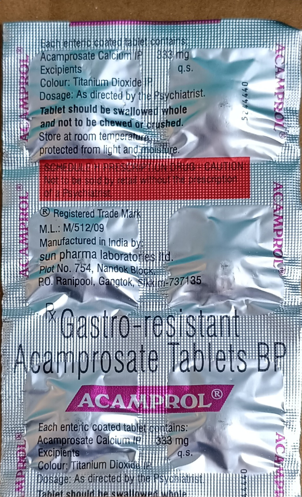 Acamprol Tablet is a medicine that is used to stop cravings in people who have completely stopped drinking alcohol. However, this medicine does not treat alcohol withdrawal symptoms or prevent the harmful effects of alcohol abuse. Acamprol Tablet should be taken with food. It is only effective when you have completely stopped drinking alcohol. If you miss a dose, take it as soon as you remember. Do not skip any doses; finish the entire course of treatment. Do not suddenly stop taking this medication without talking to your doctor.