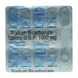 Acidose DS Tablet is an antacid used in the treatment of indigestion, metabolic acidosis and used as an alkalinizing agent. It acts as a buffer that helps neutralize excess acid and restore a healthier pH level in the body. Acidose Tablet relieves irritation by producing carbon dioxide which neutralizes the acid present in the stomach. It also increases the pH of blood and urine, thereby correcting acid indigestion, heartburn. Additionally, it helps in the removal of toxic substances from the body in certain types of poisoning. Acidose Ds 1000mg Tablet may be taken with or without food in a dose and duration as advised by the doctor. Excessive intake may cause electrolyte imbalance leading to unwanted side effects. Keep taking this medicine for as long as your doctor recommends. If you stop treatment too early your symptoms may come back and your condition may worsen.
