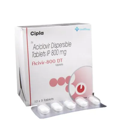 Acivir 800 DT Tablet is an antiviral medication. It prevents the multiplication of virus in human cells. This stops the virus from producing new viruses and clears up your infection.