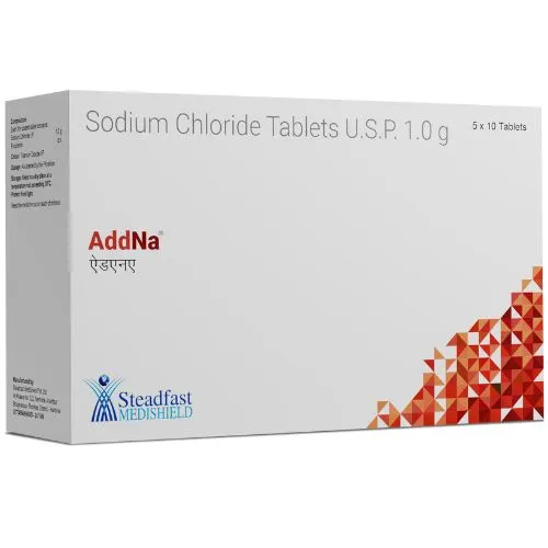 Addna Tablet is used for short-term fluid and electrolyte replacement. It helps restore lost salt and electrolytes caused by dehydration, trauma, or other conditions. Take it exactly as prescribed by your doctor. Do not stop the medication suddenly and complete the full course, even if you start feeling better. The tablet can be taken whole or dissolved in water before consumption, based on your doctor’s advice.