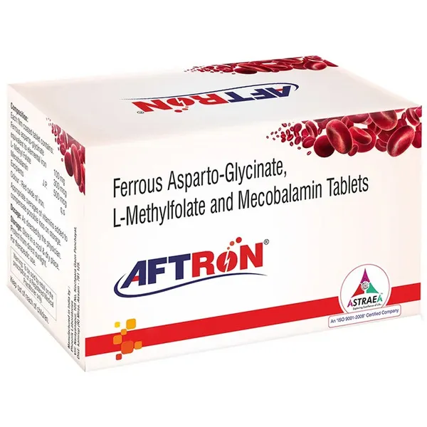 Aftron Tablet is a combination of three key nutrients: L-Methyl Folate, Methylcobalamin, and Iron, which work together to treat and prevent anemia by supporting the production of healthy red blood cells.