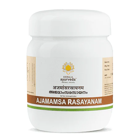 Ajamamsa Rasayanam is a traditional non-vegetarian Ayurvedic formulation prepared using goat meat (Ajamamsa), known for its nourishing and restorative properties. This classical remedy is particularly beneficial in managing various respiratory conditions such as chronic cough, bronchitis, and airway congestion. Available in herbal jam or herbal ghee form, Ajamamsa Rasayanam helps strengthen muscles, improve bone health, and support the respiratory system. It also provides relief from flatulence and supports overall vitality and immunity.