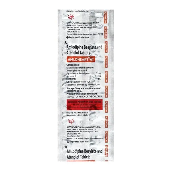 Amloheart AT 5mg/50mg Tablet is a combination medicine used to treat hypertension (high blood pressure) and angina (chest pain). It contains Amlodipine, a calcium channel blocker, and Atenolol, a beta-blocker. These medicines work together to relax blood vessels and reduce heart rate. This helps lower blood pressure and reduce the strain on the heart. Amloheart AT is used when a single medication is not enough to control blood pressure. It also helps reduce the risk of heart attacks, strokes, and other complications. It must be taken regularly to maintain its effectiveness.