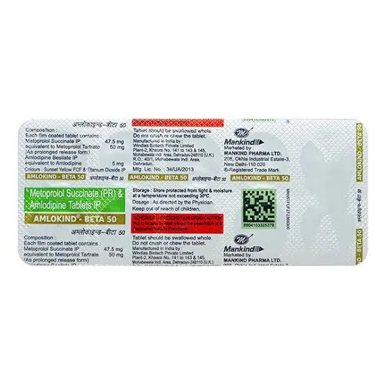 Amlokind Beta 50 contains two active drugs: Amlodipine and Metoprolol. Amlodipine is a calcium channel blocker. It relaxes the blood vessels, allowing blood to pass more easily. This lowers blood pressure and increases oxygen flow. Metoprolol is a beta-blocker. It slows the heart rate and reduces the heart’s workload. Together, these medicines improve heart function. They reduce pressure in the arteries and help prevent chest pain. Oxygen reaches the heart more effectively. The heart beats with more control and less stress. This reduces the risk of long-term damage. The medicine should be taken at the same time every day. Do not skip doses or stop without medical advice. Lifestyle changes like regular activity and healthy eating support its benefits.