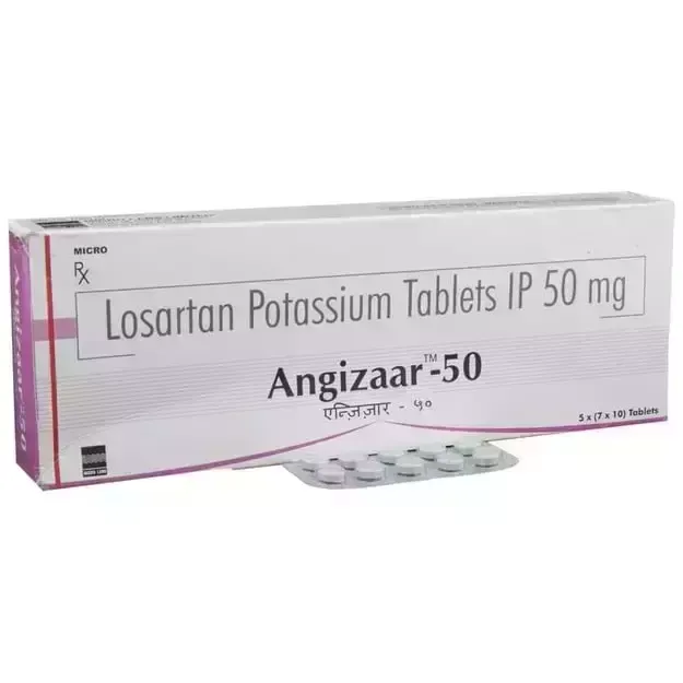 Angizaar 50 Tablet is a prescription medicine used to treat high blood pressure (hypertension) and heart failure. It belongs to a group of drugs called angiotensin receptor blockers (ARBs). These medications help relax blood vessels, making it easier for the heart to pump blood. Lowering blood pressure with Angizaar reduces the risk of heart attacks, stroke, and kidney problems, especially in people with diabetes. It may be used alone or in combination with other medications. Angizaar is commonly used for long-term management and is generally well tolerated when taken as prescribed.