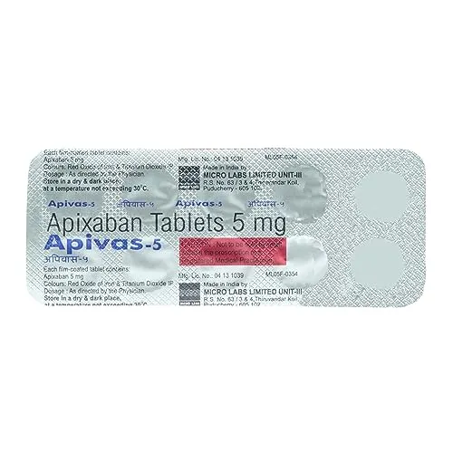 Apivas 5 Tablet is a prescription anticoagulant medicine used to prevent and treat blood clots in conditions such as deep vein thrombosis (DVT) and pulmonary embolism (PE). It also reduces the risk of stroke and systemic embolism in patients with non-valvular atrial fibrillation, a condition where the heart beats irregularly and increases the risk of clot formation. The active ingredient, Apixaban, is classified as a direct Factor Xa inhibitor, which means it directly blocks one of the key enzymes involved in the blood clotting process. By doing so, it helps maintain smooth blood flow and lowers the risk of clot-related complications such as strokes, heart attacks, or blocked arteries in the lungs or legs. Apivas 5 Tablet offers a predictable anticoagulant effect and does not require routine blood monitoring, which makes it a convenient long-term treatment option for eligible patients.