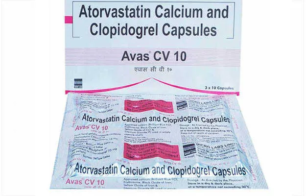 Avas CV 10 Capsule is a combination medicine that contains Atorvastatin (a statin) and Clopidogrel (an antiplatelet). It is primarily used for the prevention of heart attacks and strokes in patients with high cholesterol or a history of cardiovascular disease. It works by lowering harmful cholesterol and preventing the formation of blood clots in the blood vessels.