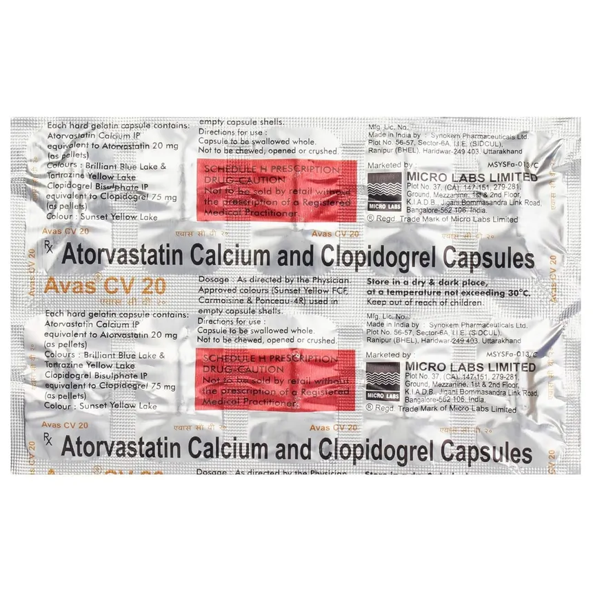Avas CV 20 Capsule is a combination medicine that contains Atorvastatin (a statin) and Clopidogrel (an antiplatelet). It is primarily used for the prevention of heart attacks and strokes in patients with high cholesterol or a history of cardiovascular disease. It works by lowering harmful cholesterol and preventing the formation of blood clots in the blood vessels.