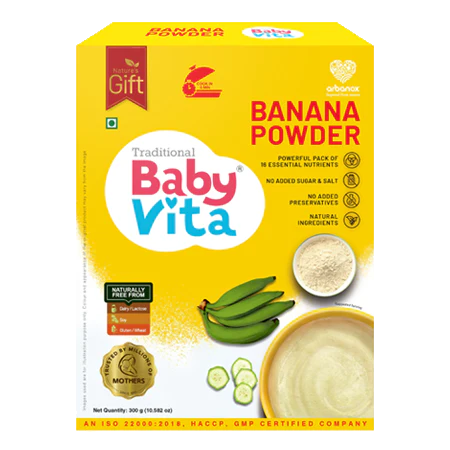Arbanox BabyVita Banana Powder is a nutritious and natural food supplement for babies, based on a traditional recipe using high-quality Nendran bananas. Rich in essential nutrients like potassium, vitamins, and dietary fiber, it supports healthy growth and development. Free from added sugar and preservatives, it offers a safe, wholesome option trusted by mothers worldwide.