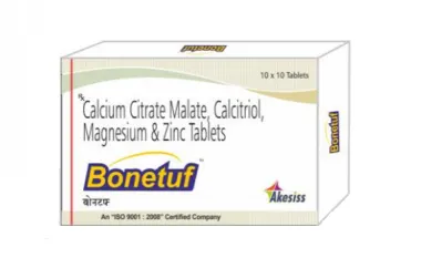 Bonetuf Tablet is a bone health supplement formulated with essential minerals and vitamins that support bone strength, density, and function. It contains Calcium Citrate Malate, Calcitriol, Magnesium Hydroxide, and Zinc Sulphate, working together to maintain bone integrity and prevent bone loss. Bonetuf is especially beneficial for individuals with osteoporosis, post-menopausal bone degeneration, or those recovering from surgery or parathyroid-related conditions. This supplement helps meet daily calcium and mineral requirements while also supporting the normal function of nerves, muscles, and cells. Its targeted formula reduces the risk of fractures and maintains skeletal strength over time.